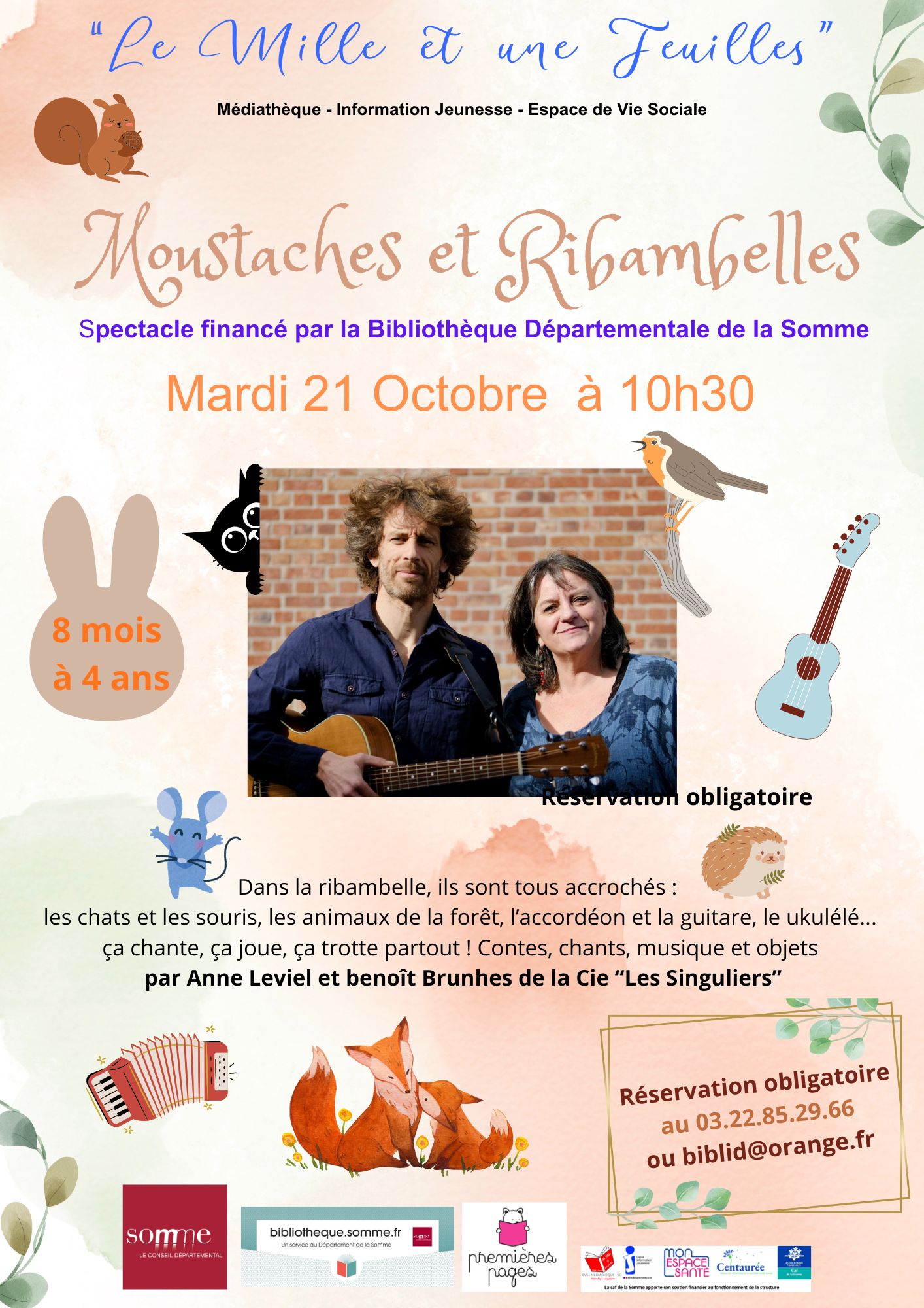 Spectacle MOUSTACHES ET RIBAMBELLES Détails des prochaines sessions Du mercredi 08 octobre 2025 à 16:21 au mardi 21 octobre 2025 à 10:21 Lieu Monchy-Lagache Public Tout-petits Catégorie Spectacle Afficher les options de partage × Partager